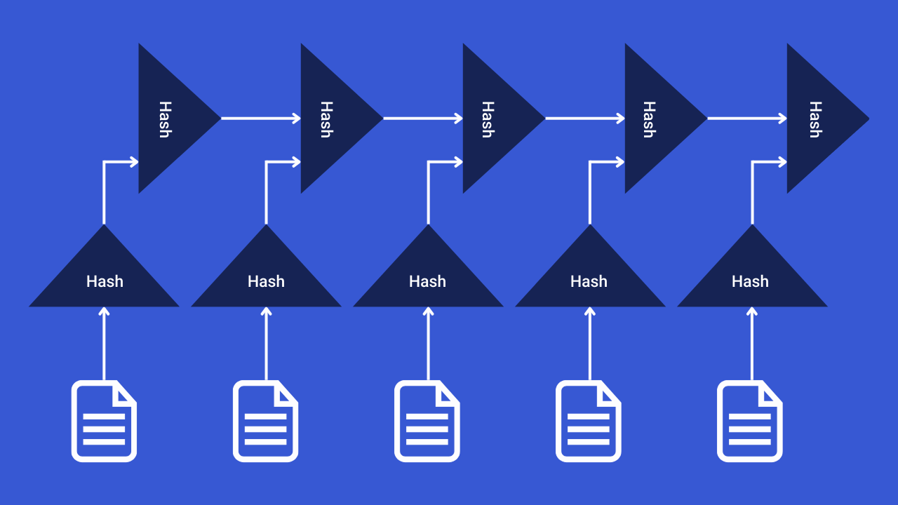 Chaque document horodaté est donc lié au document précédent, ce qui implique que chaque modification frauduleuse du document ou de sa date après son horodatage viendrait casser toute la chaîne des documents et serait donc facilement trouvable. Ce concept de chaînage des hachages est considéré comme une forme primitive de ce qui deviendra plus tard la blockchain de Bitcoin.