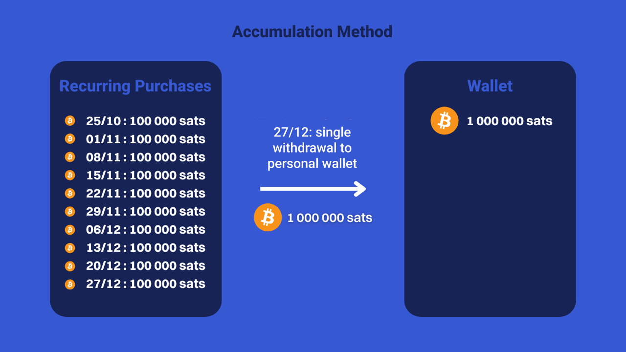 In this second case, it is possible to carry out consolidation transactions. However, to avoid additional fees, a relevant strategy would rather be to accumulate a certain amount of satoshis before triggering a withdrawal. This approach allows you to take full advantage of the DCA method, while avoiding the risk associated with owning small UTXOs, while enjoying the benefits of autonomous conservation.