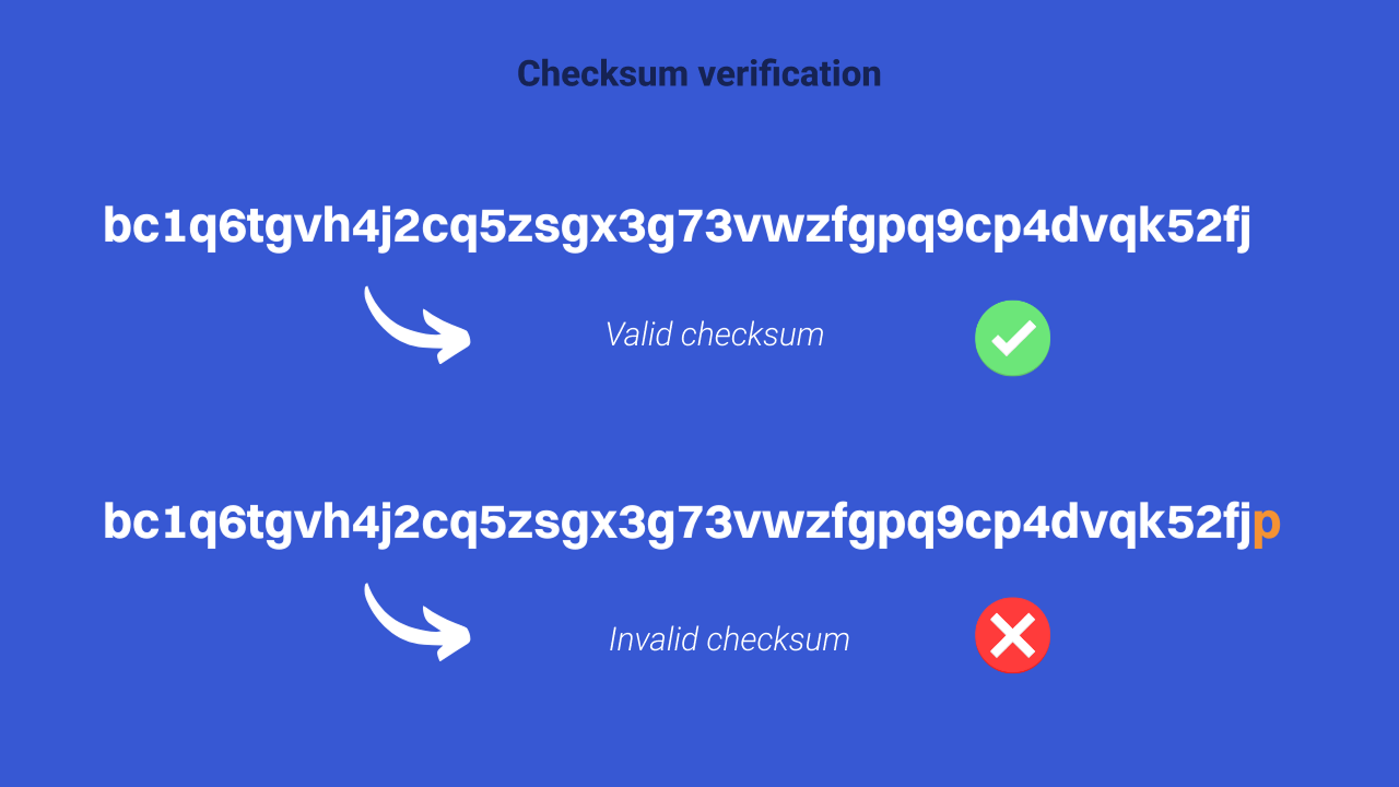 As we saw in the previous part, Bitcoin receiving addresses incorporate a checksum. This value, calculated from the address itself, is added at the end of the address to ensure its integrity and validity during transmission.