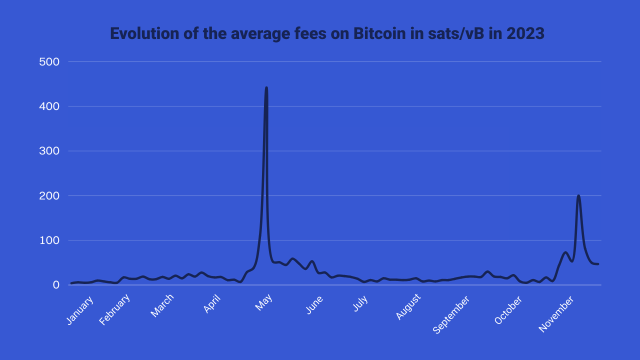 The meteoric rise of the Ordinals peaked in May 2023 with the emergence of BRC-20. This protocol, which is rather rudimentary, allows the creation of tokens attached to Bitcoin via Ordinals registrations. BRC-20 tokens quickly became the subject of uninhibited speculation, leading Bitcoin transaction fees to historic levels. This sudden increase in fees had consequences, especially on the Lightning network, where it became difficult to open or close channels during this period.