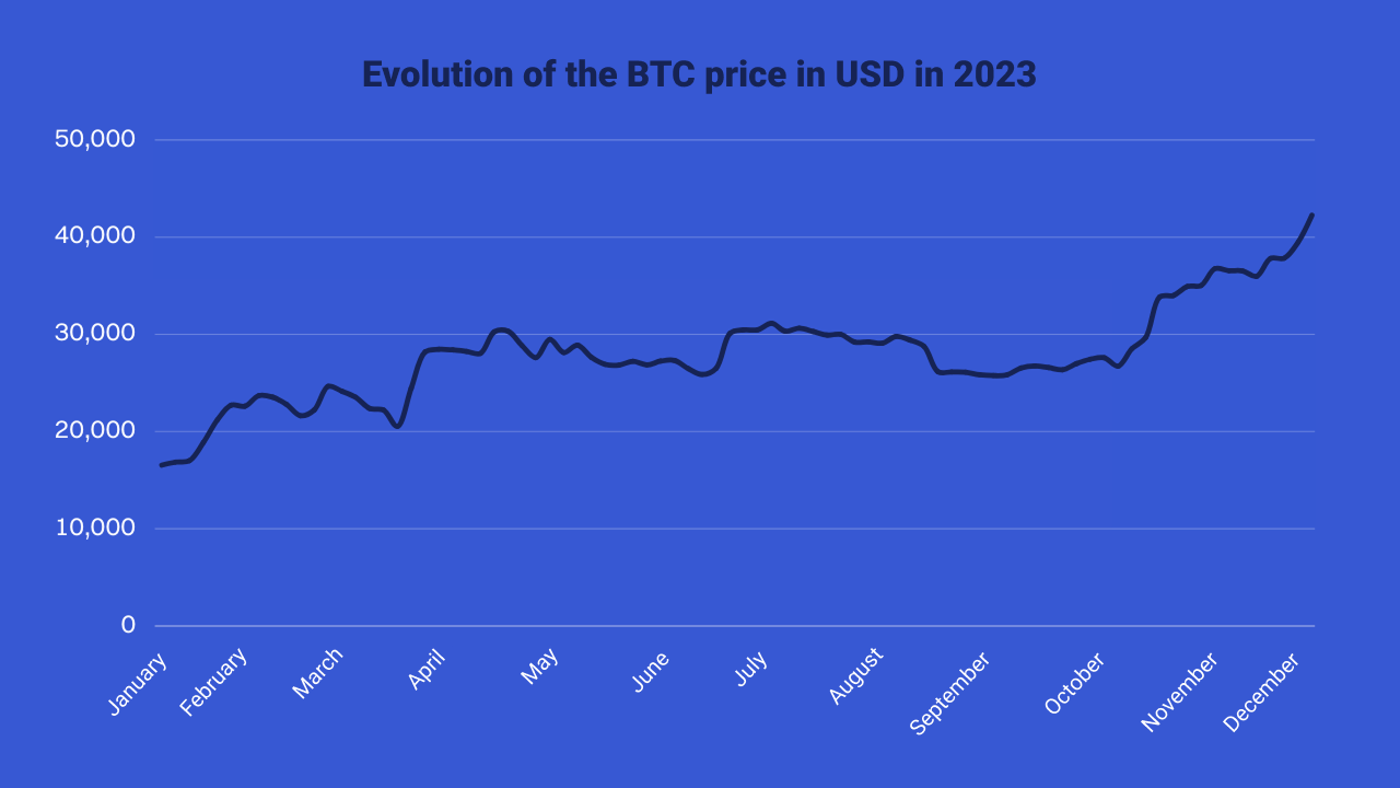 Let's take a look at the essential data concerning Bitcoin for the year 2023 together. Let's start with the value of BTC, which has increased significantly during this time. On January 1, 2023, the year started with a price of $16,537. Although 2023 is not over yet, at the time of writing, the Bitcoin price is $42,260, which represents an increase of 156%.