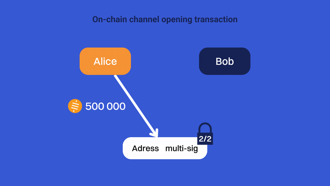 If Alice is at the origin of this opening of the channel, she will ask Bob for his public key, then she will build a deposit transaction to block bitcoins on the multi-signature address. She also asks Bob for a signature on a withdrawal transaction in order to eliminate the need for trust in him as much as possible. Once the communications between the protagonists have been made, Alice can broadcast her deposit transaction on the Bitcoin network.