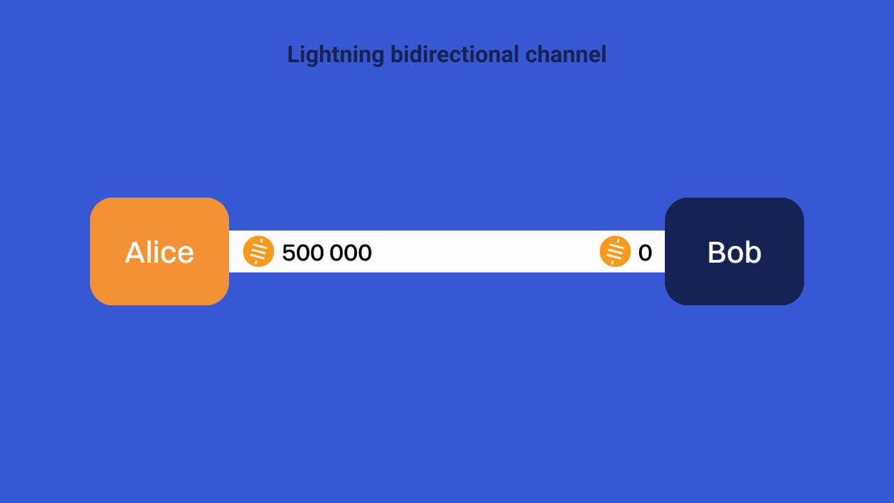 In our example, let's imagine that Alice was behind the creation of the channel, and that she deposited 500,000 SATS on it. These satoshis are currently on her side of the canal, since she was the one who put them down.