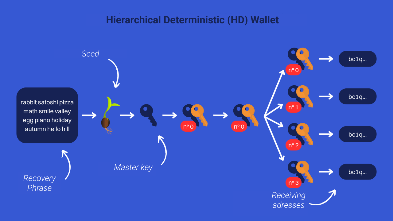 Subsequently, developers therefore designed a portfolio structure that facilitated the derivation of several keys. This is the so-called “hierarchical deterministic” (HD) portfolio. Its principle is that a multitude of unique key pairs are generated from a single piece of information: the seed (or “seed” in English). This seed can be encoded in a form readable by humans in order to obtain the famous recovery phrase of 12 or 24 words.