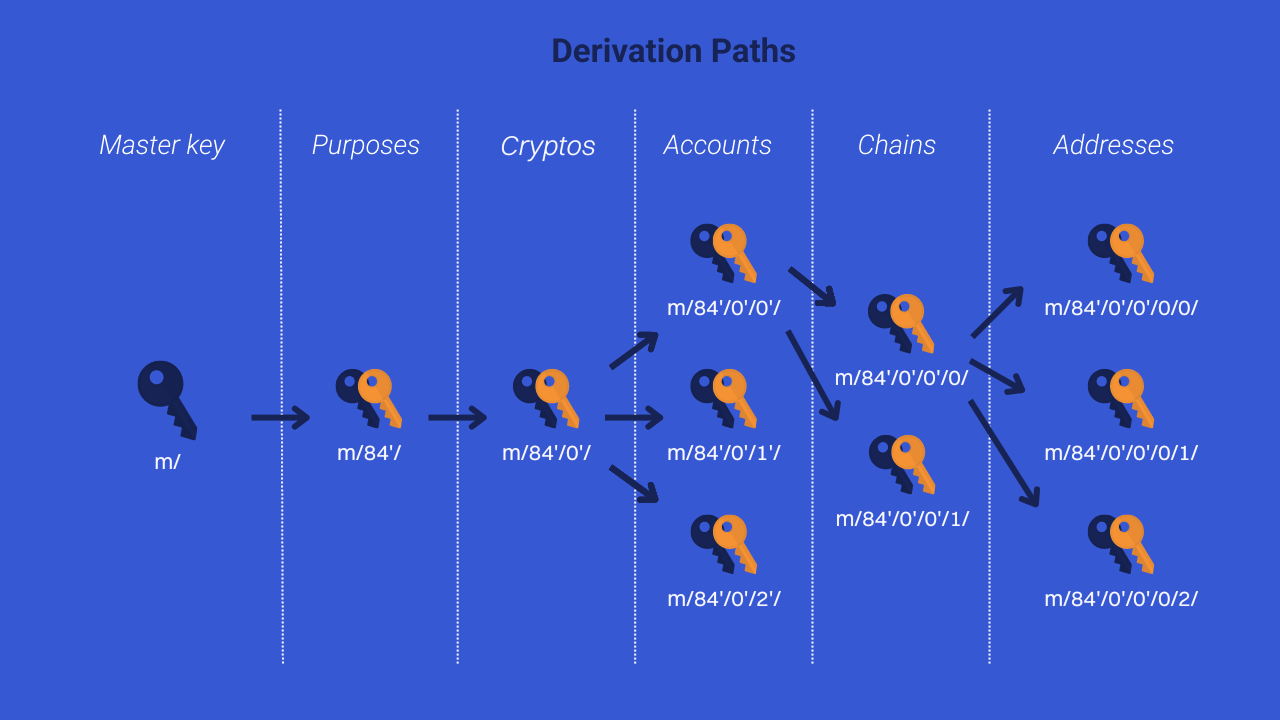 For example, the index 84' is used on the first derivation stage to indicate that you are on a SegWit V0 wallet (with addresses starting with “bc1q...”). The second derivation stage is used to separate the different cryptocurrencies in the same wallet. And the third floor makes it possible to generate several separate accounts.